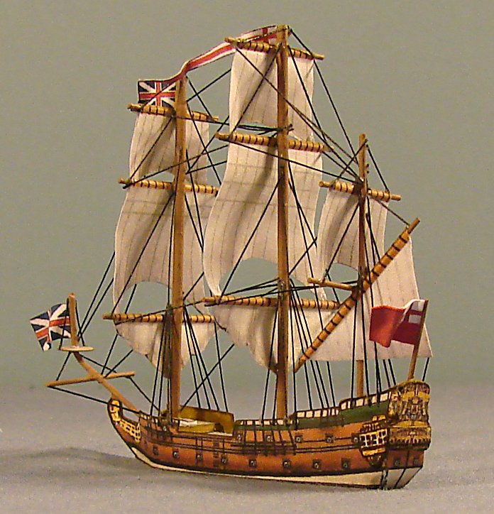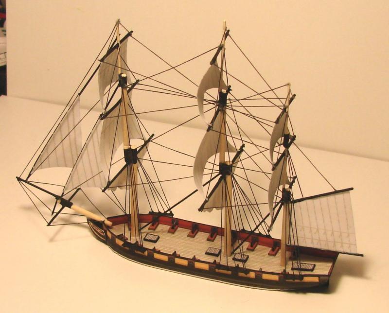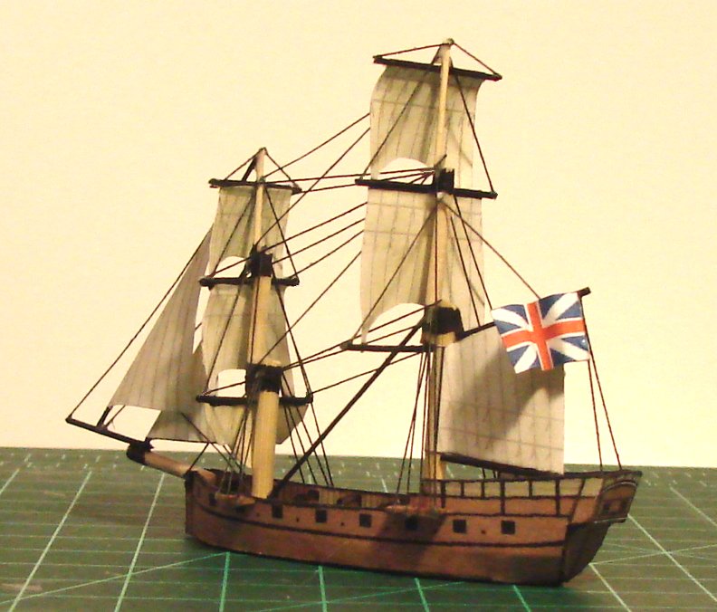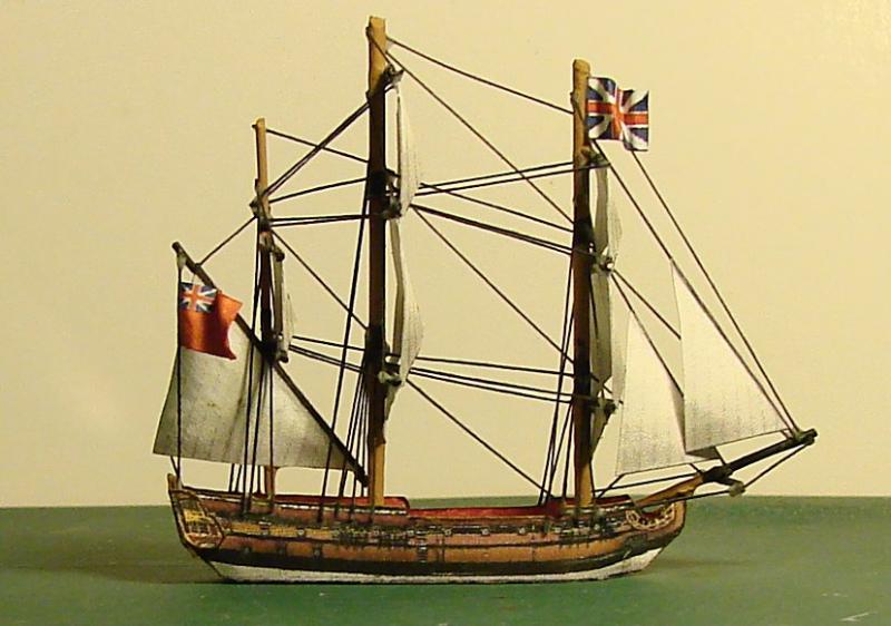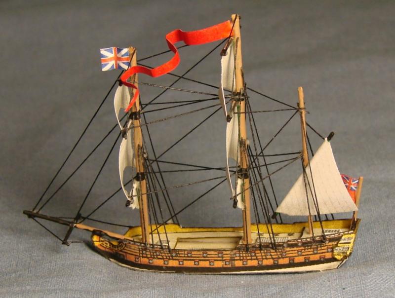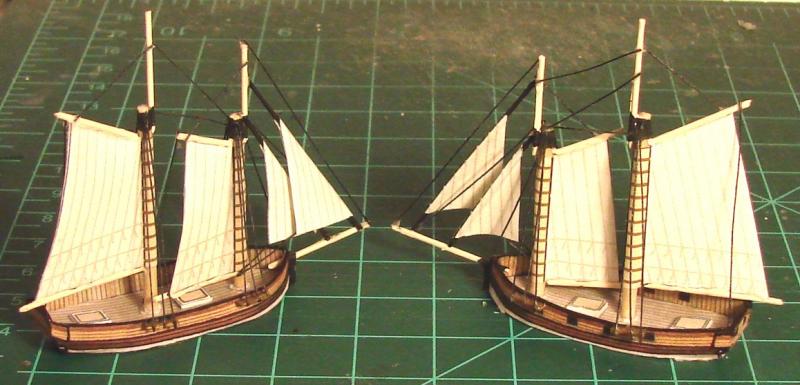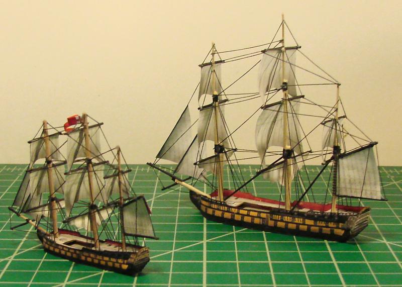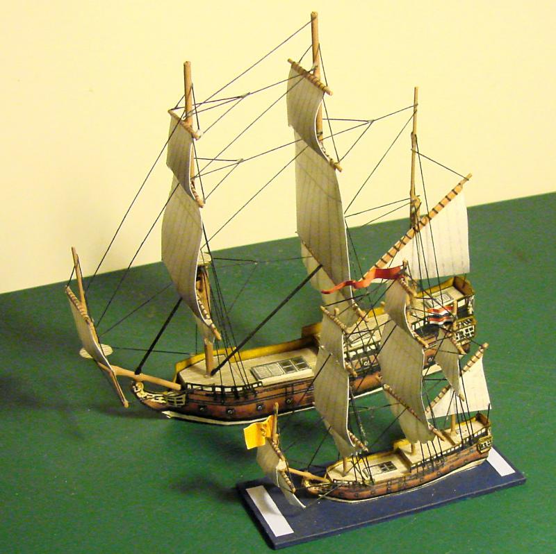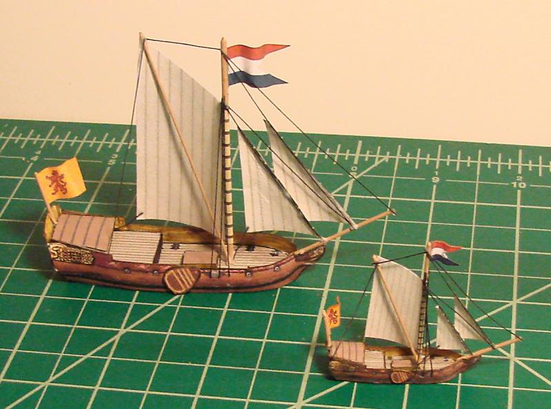 I'm well into the 1:600 scale Anglo-Dutch series. A suggestion on a discussion board on TMP led me to wonder just how re-scalable these would be, so I printed one out at 200% and doubled the thickness of the laminated parts. Beyond that, I just followed the instructions as-is, and I'm very pleased with the result. This photo is of the 28-gun frigate (Kit #203) in both 1:600 and 1:300 scale: