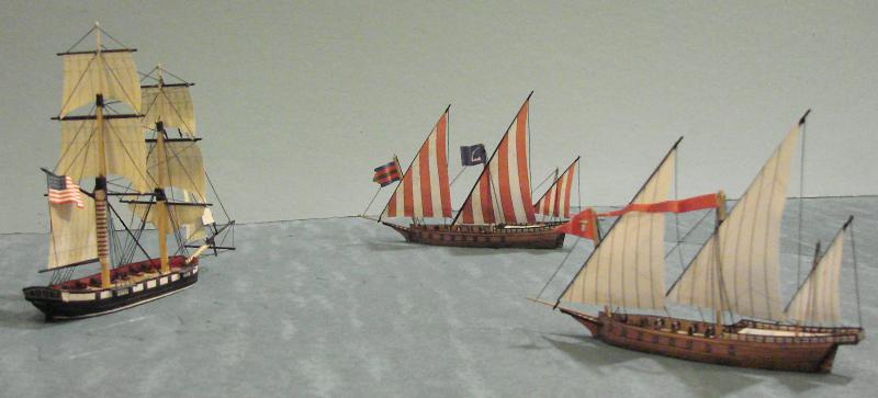 and here's a view of an American brig taking on a pair of Algerines during the Second Barbary War:
