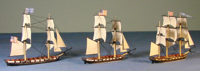 Work is progressing on the first ships of the new series, "Lake Erie 1813". Shown below are USS Niagara on the left, and HMS Detroit on the right. The model in the center is USS Argus, one of the variants which will be included in the Detroit kit.
